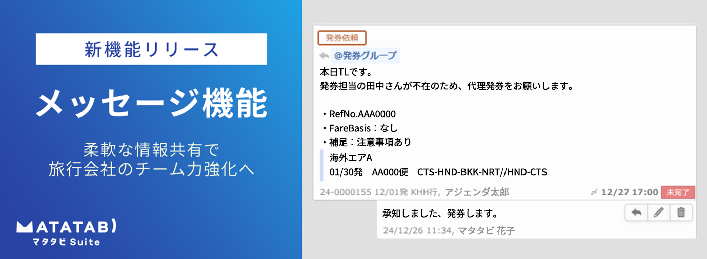 2024年12月25日(水)、株式会社アジェンダ(本社:北海道札幌市、代表取締役社長:伊藤 智裕)は、旅行会社向けクラウドサービス「マタタビ Suite」にて、「メッセージ機能」を新たにリリースしました。
