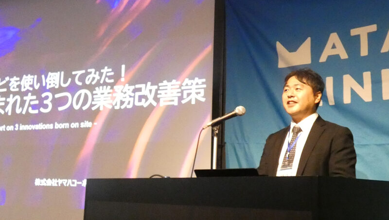本社営業2部 部長の天田様が、「属人化からチームワークへ~全社で使うマタタビ Suite~」と題し登壇。チェックシートを活用した標準化の取り組みや、チーム全体でのシステム活用促進の工夫が語られました。
