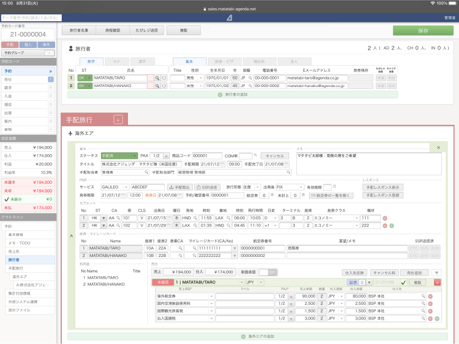 - 団体旅行、国内旅行、海外旅行、すべての旅行の予約が1つの共通画面から登録・編集できます。予約の登録や仕入に対する支払消込が簡単になるほか、確認や手配の抜け漏れミスを防ぎます。