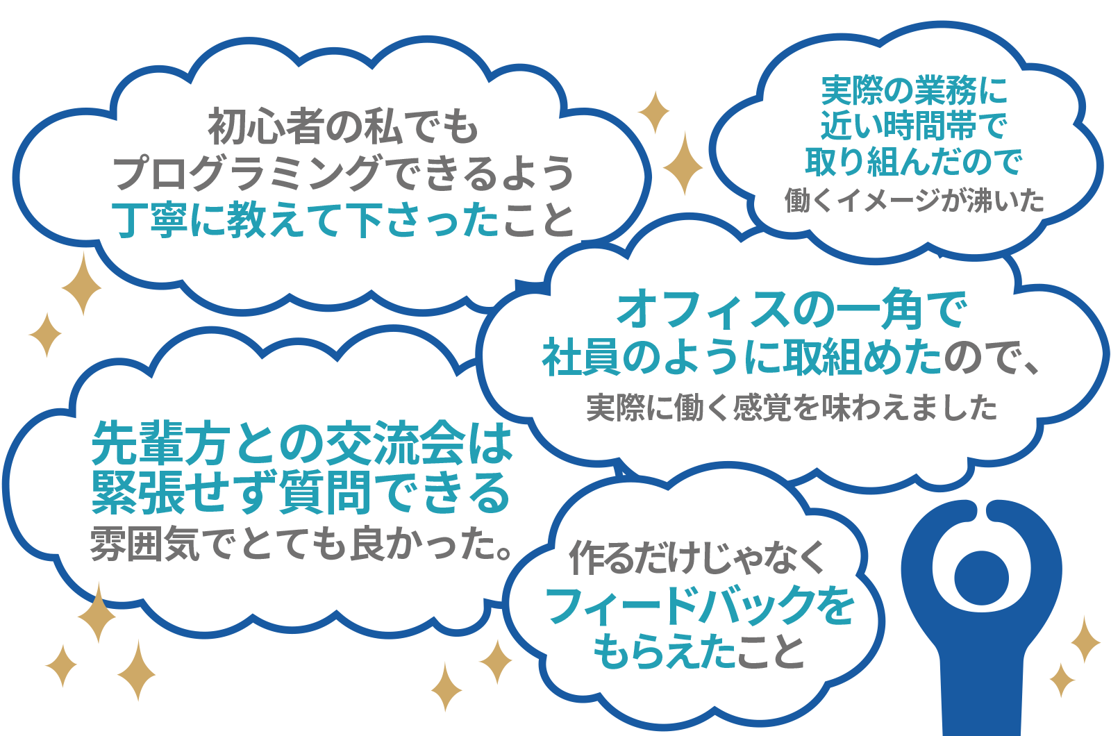 最後に、過去インターンシップに参加された方々からアンケートでいただいたご意見や感想について紹介します。