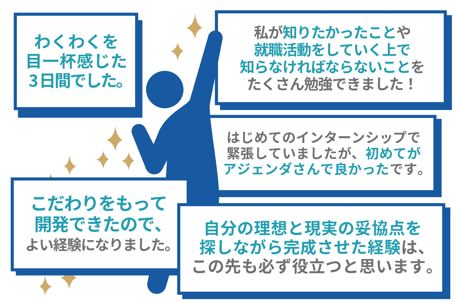 本ページでは、アジェンダのインターンシップについて「テーマ」「取り組みの流れ」「参加者の声」をそれぞれお伝えいたします。インターンシップへの参加をご検討中の方は、ぜひご覧ください♪