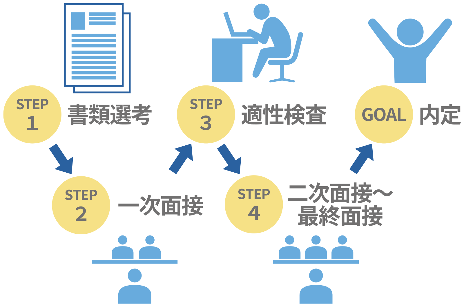 最初に応募書類による書類選考を行い、これを通過すると面接へ進みます。
