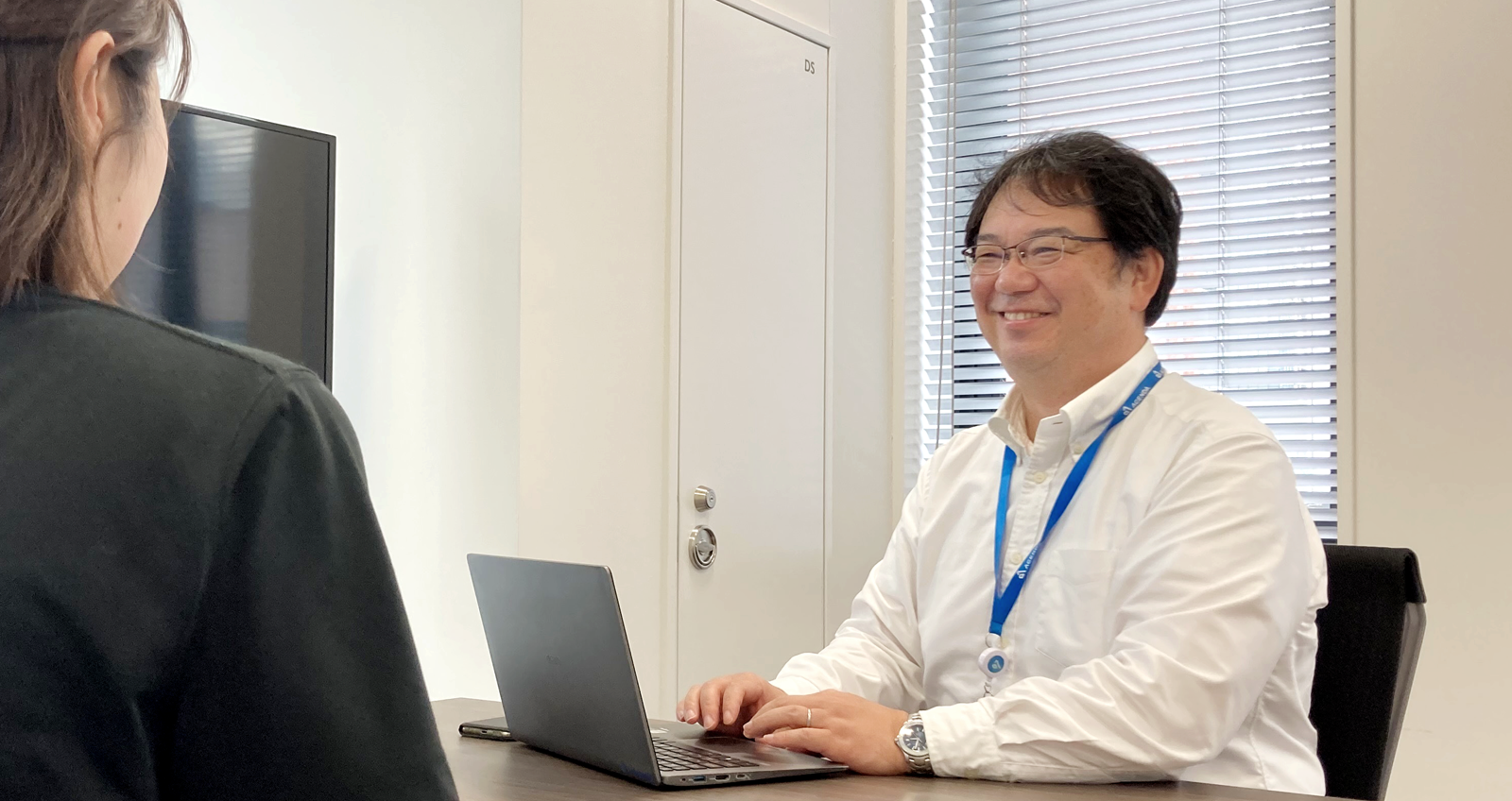 一次面接は、人事担当との面接です。私ともう1名が面接官としてお話しします。