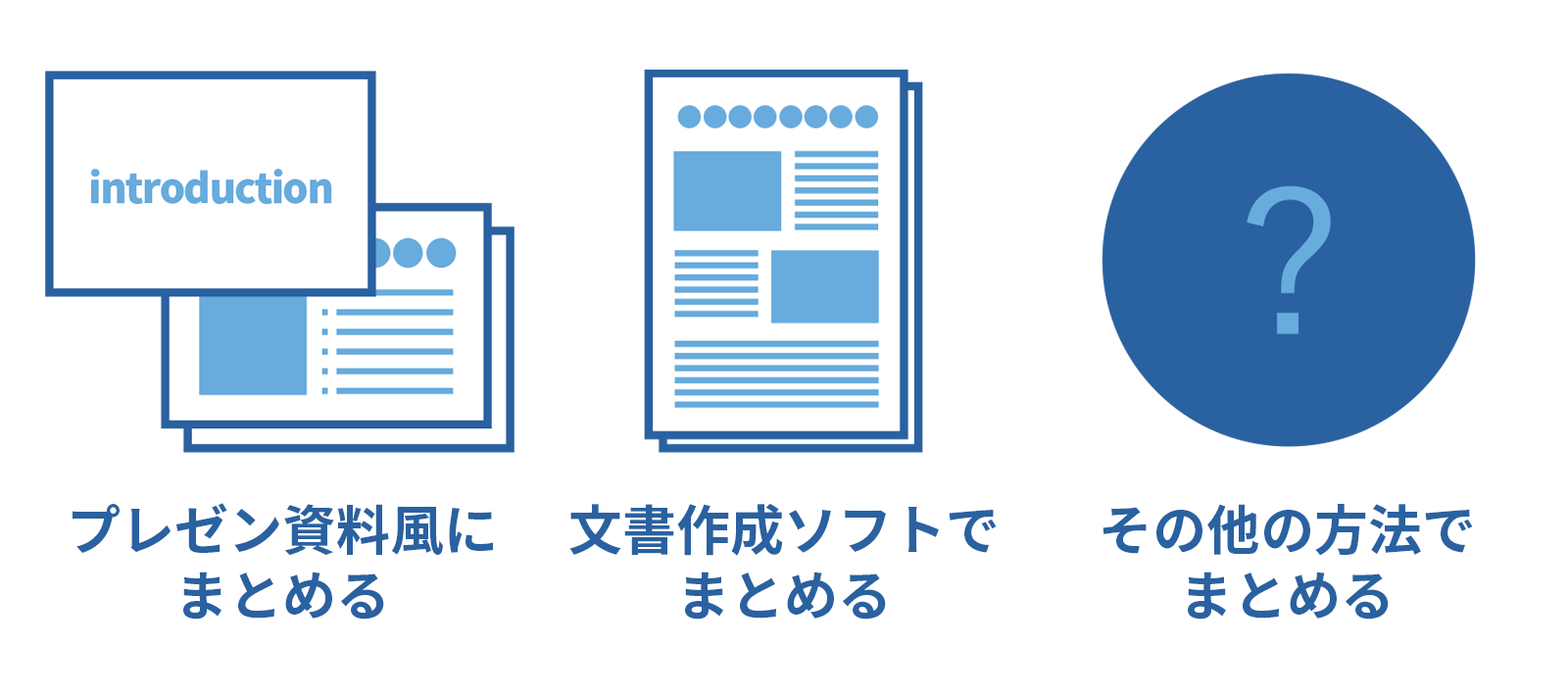 人によって様々ですが、WordやPowerPointで作った資料を印刷したものが多い印象です。図や写真を入れてグラフィカルにまとめる人もいれば、テキストだけでさらっとまとめる人もいます。