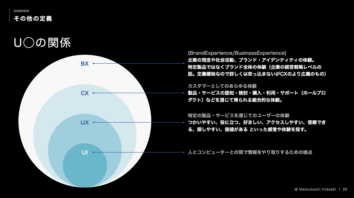 UI=人とコンピューターの接点 / UX=ユーザーの体験